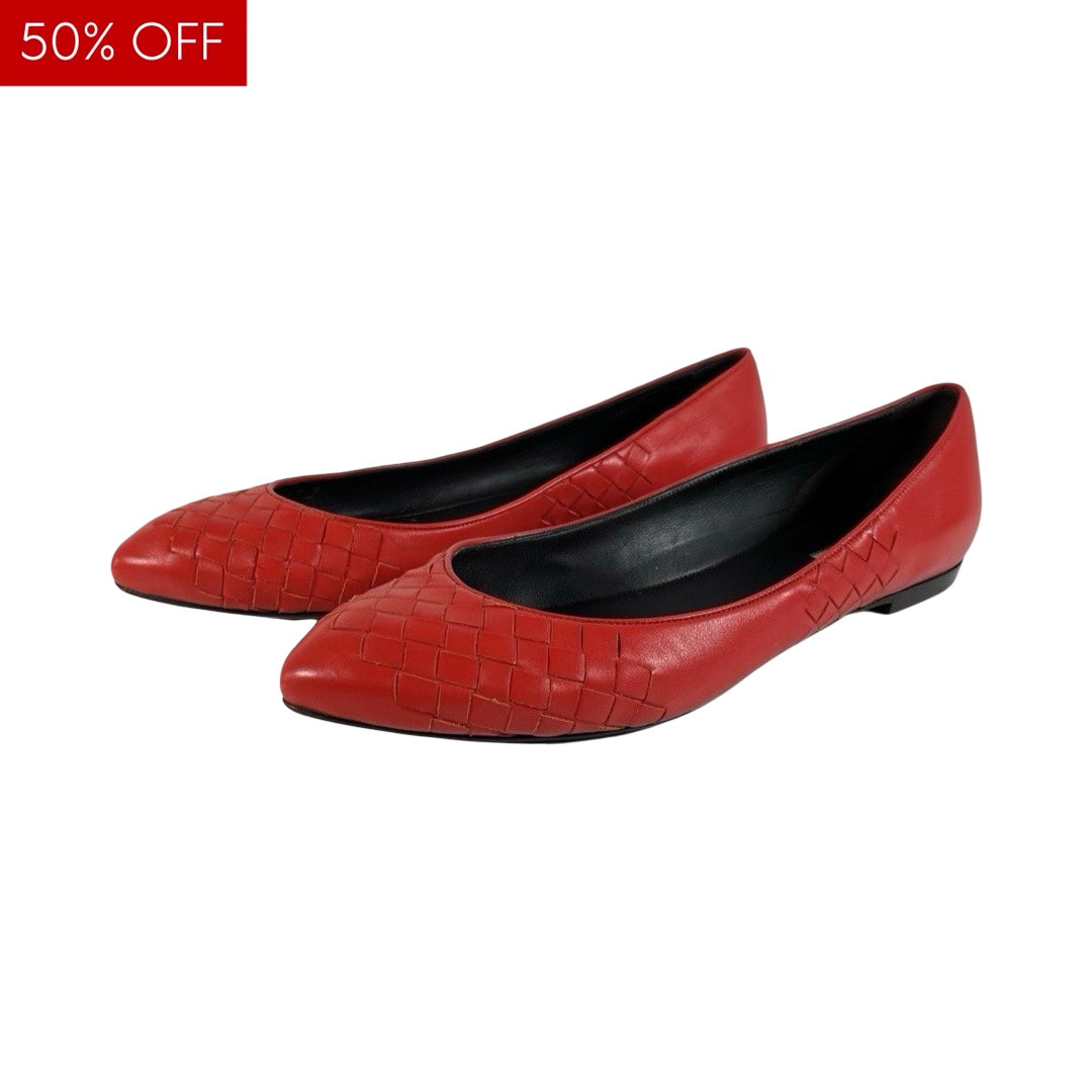 This is an authentic pair of Bottega Veneta red leather intrecciato flats.