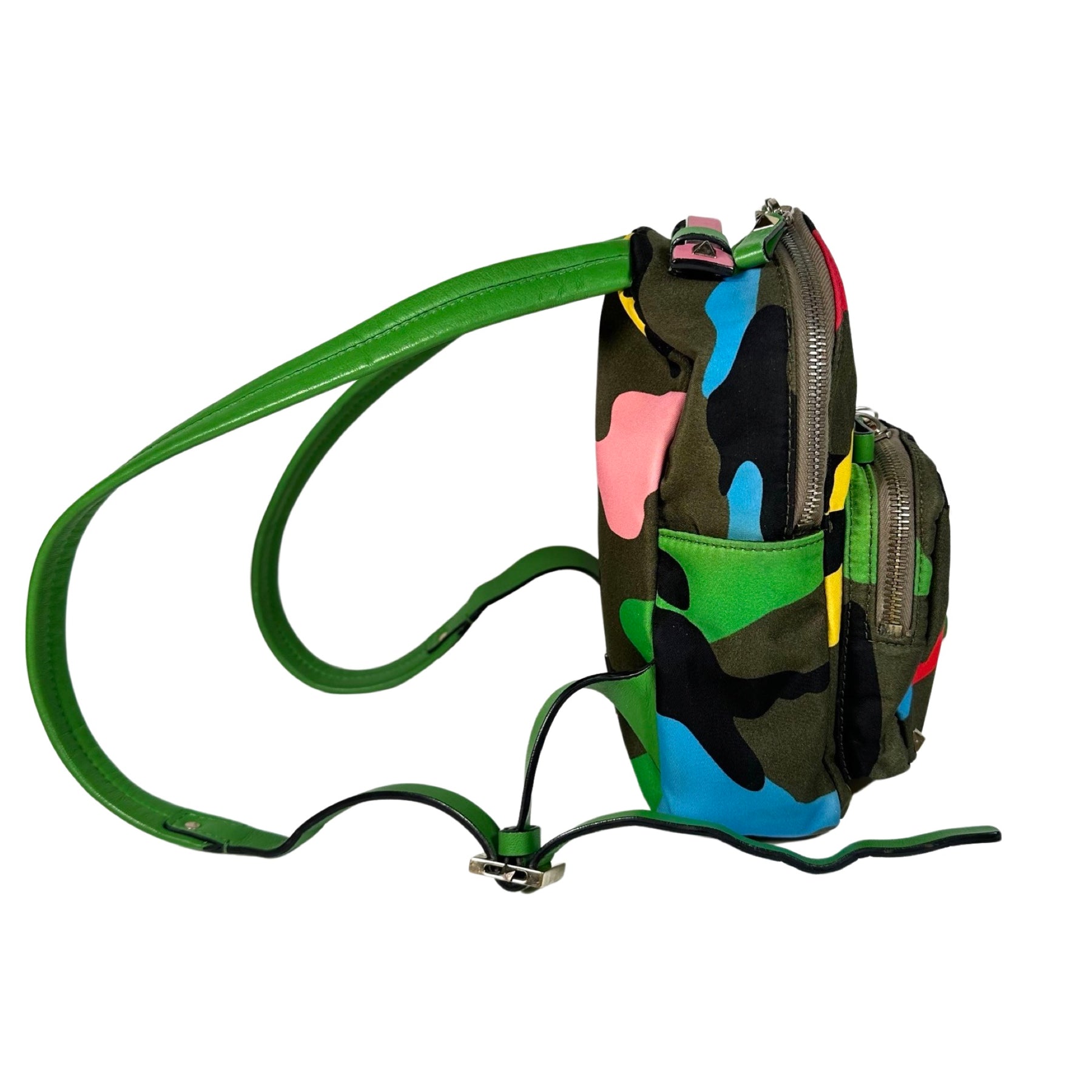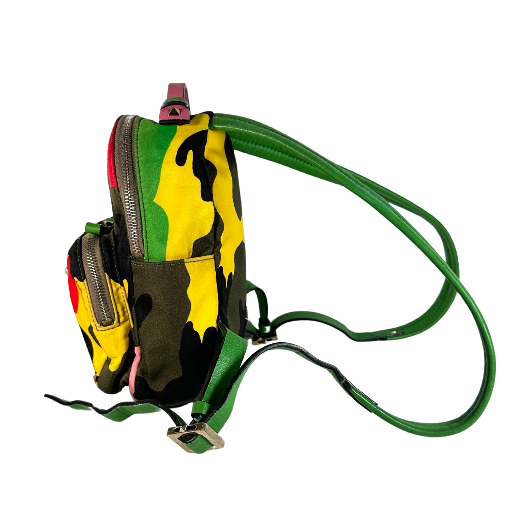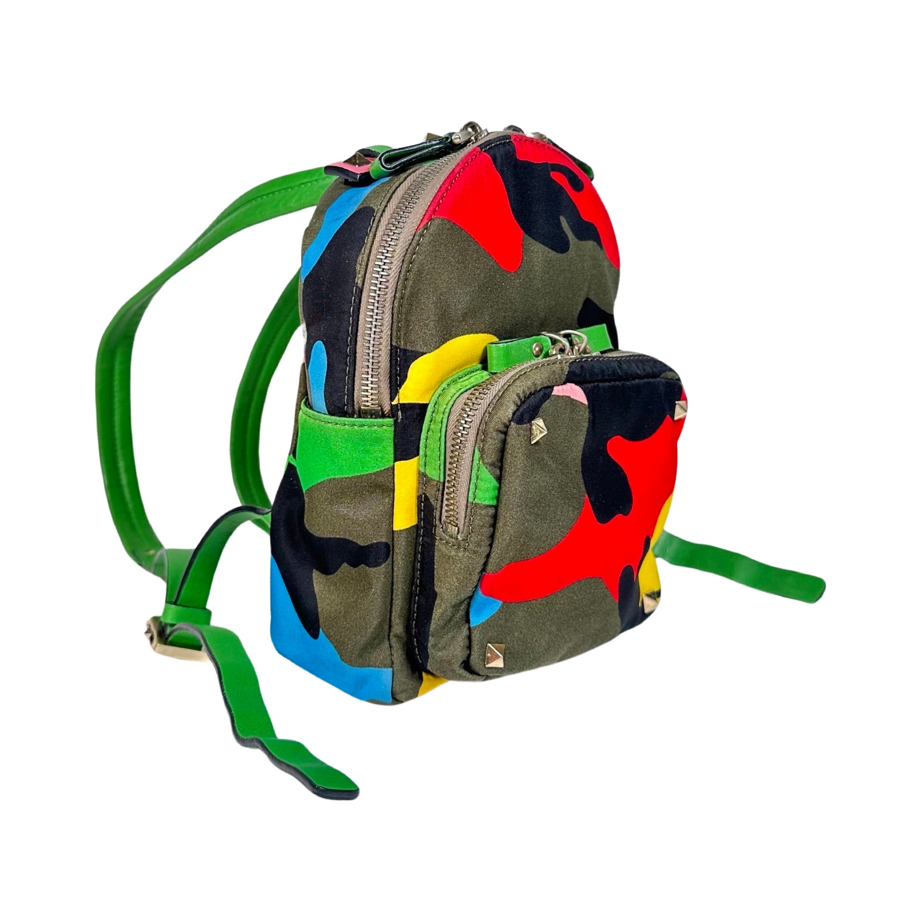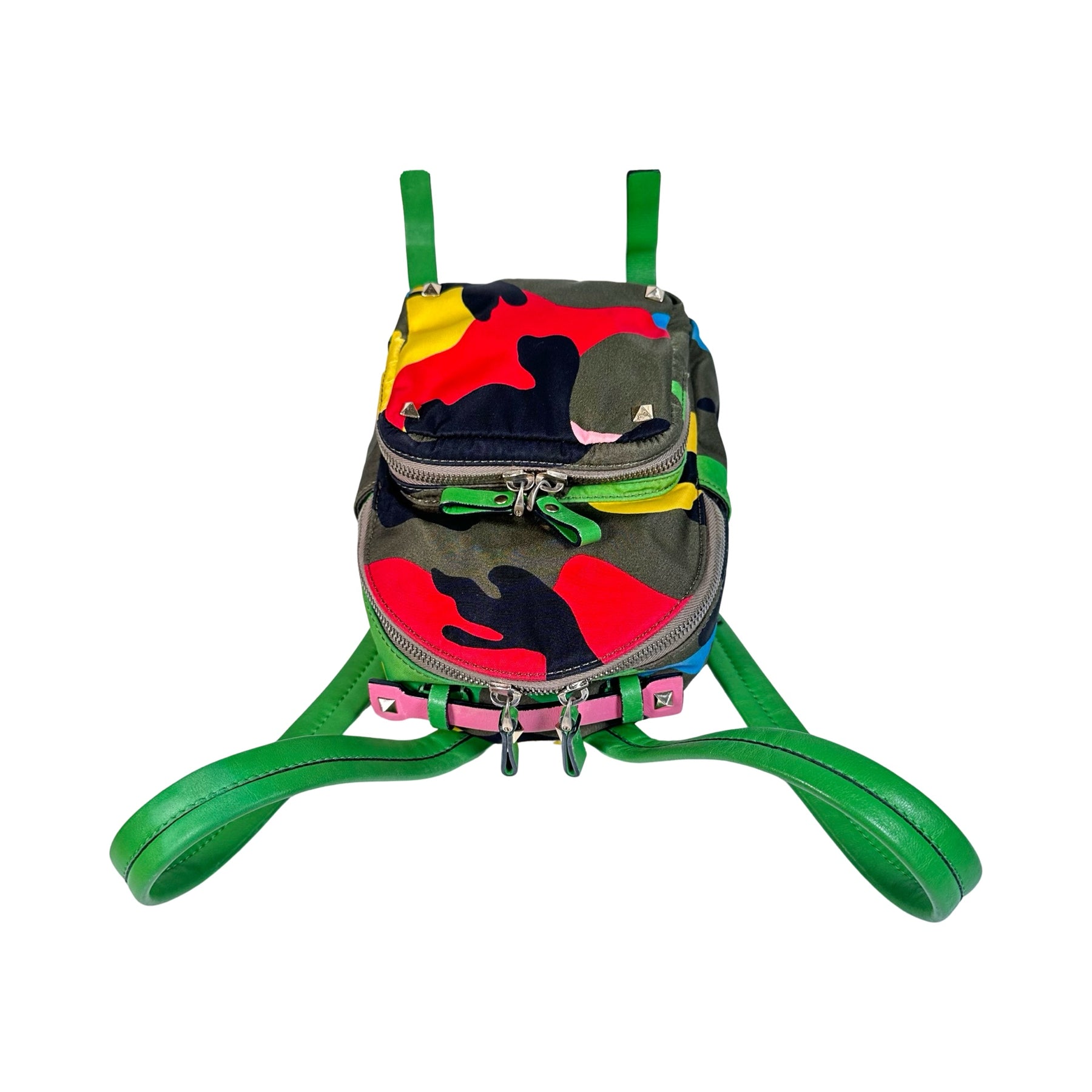 This is an authentic Valentino Garavani Psychedelic Camo Mini Nylon Rockstud Backpack in army green, red, yellow, bright green, teal and black nylon with bright green adjustable straps and pink leather trim. This bag features the iconic Valentino rockstuds in silver. There is a front double zippered compartment, two small side open compartments and a double zippered main compartment.